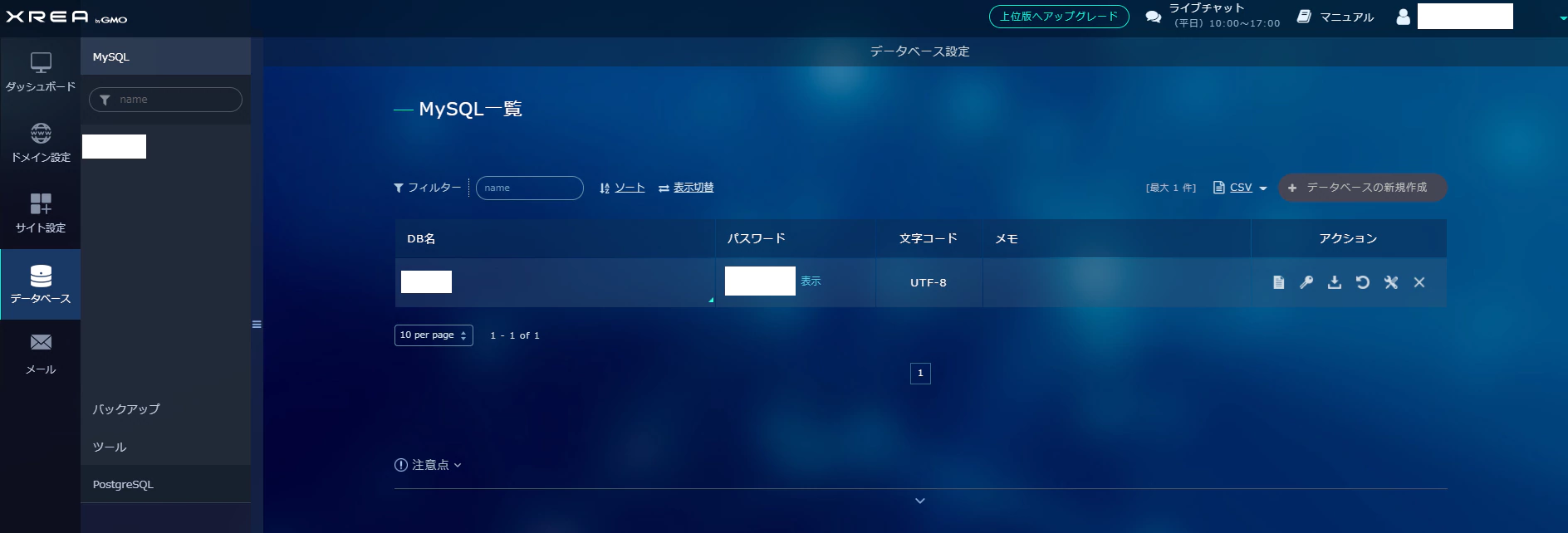 • 左の"データベース設定"を選択し、右のボタンからMySQLのデータベースを新規作成する。