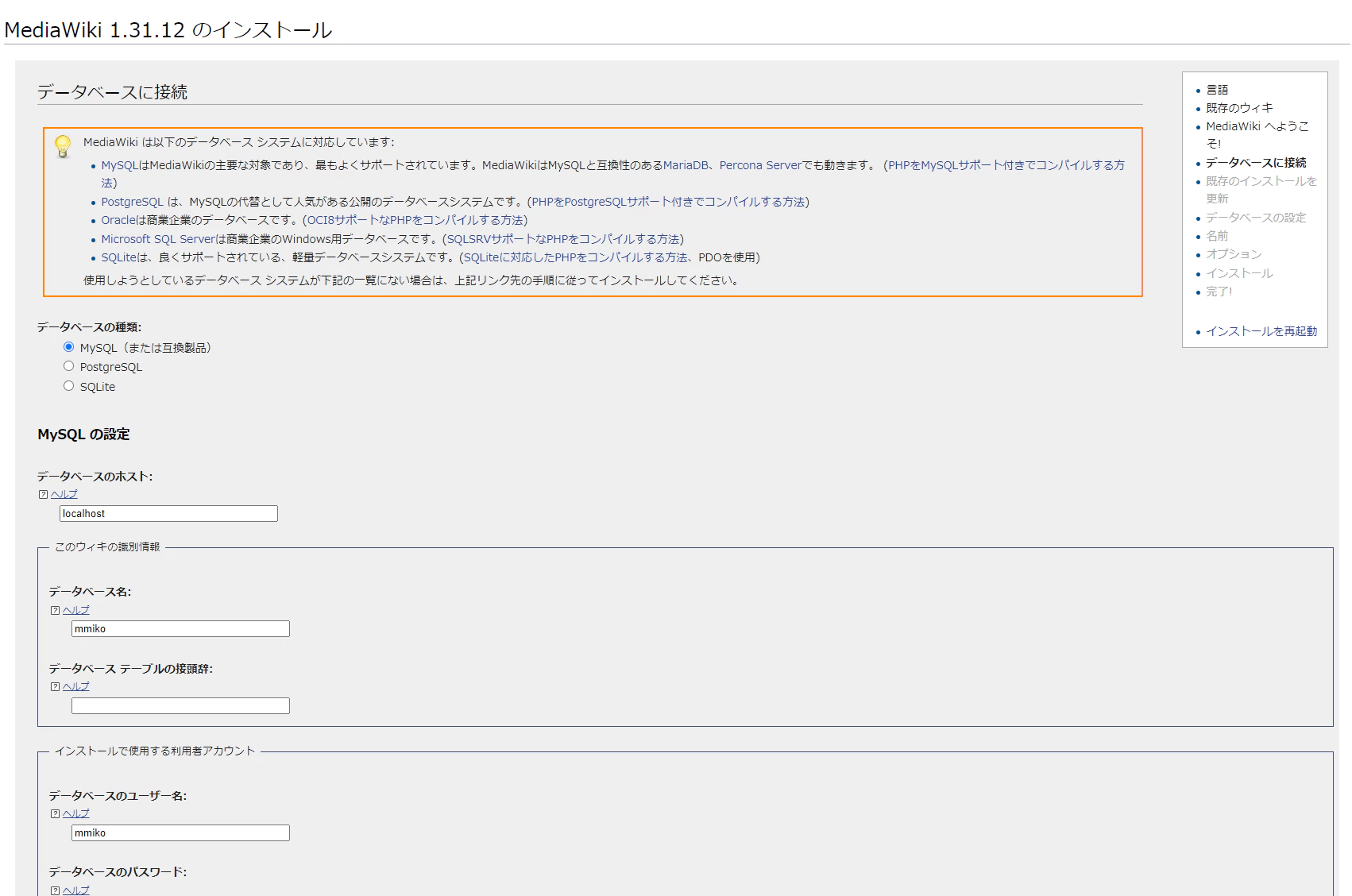 • SQLの設定では、データベース名とデータベースのユーザー名が同じになるはずである。筆者の場合は以下のようになる。